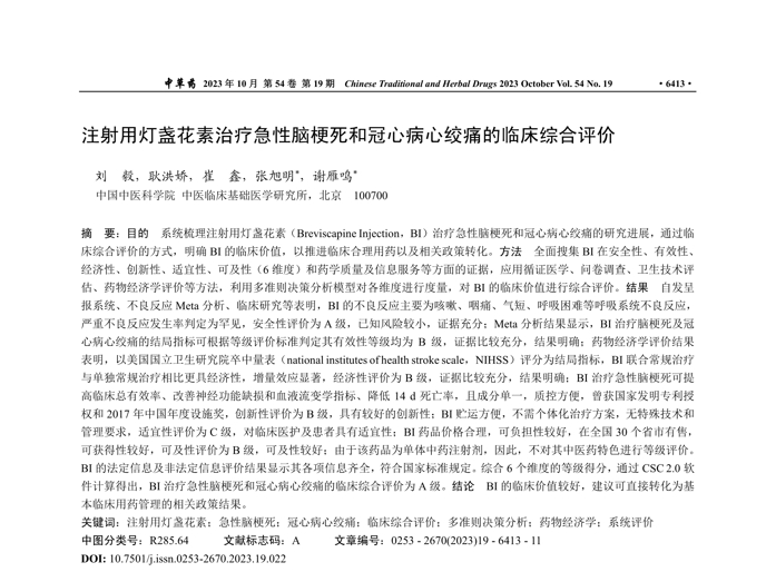題目:注射用燈盞花素治療急性腦梗死和冠心病心絞痛的臨床綜合評(píng)價(jià)劉毅,耿洪嬌,崔鑫,張旭明*,謝雁鳴*中國(guó)中醫(yī)科學(xué)院中醫(yī)臨床基礎(chǔ)醫(yī)學(xué)研究所,北京100700摘要:目的系統(tǒng)梳理注射用燈盞花素(BreviscapineInjection,BI)治...