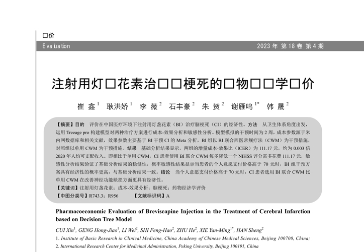題目:注射用燈盞花素治療腦梗死的藥物經(jīng)濟(jì)學(xué)評(píng)價(jià)崔鑫1耿洪嬌1李薇2石豐豪2朱賀2謝雁鳴1*韓晟21.中國(guó)中醫(yī)科學(xué)院中醫(yī)臨床基礎(chǔ)醫(yī)學(xué)研究所,北京100700;2.北京大學(xué)醫(yī)藥管理國(guó)際研究中心,北京100191